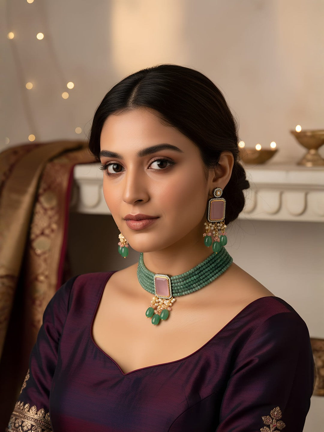 Dastoor Pink and Green Kundan-Studded Beaded Jewellery Set