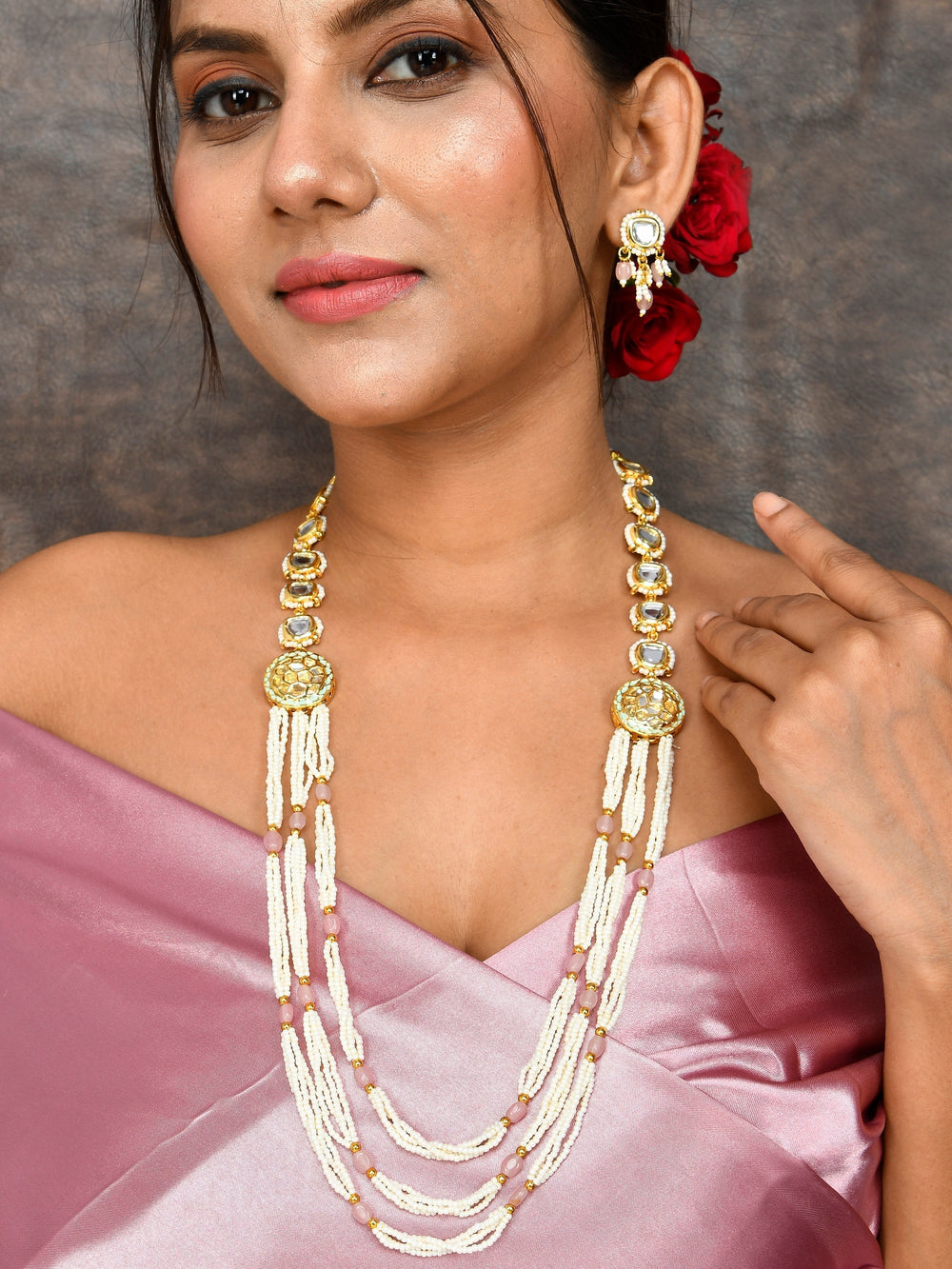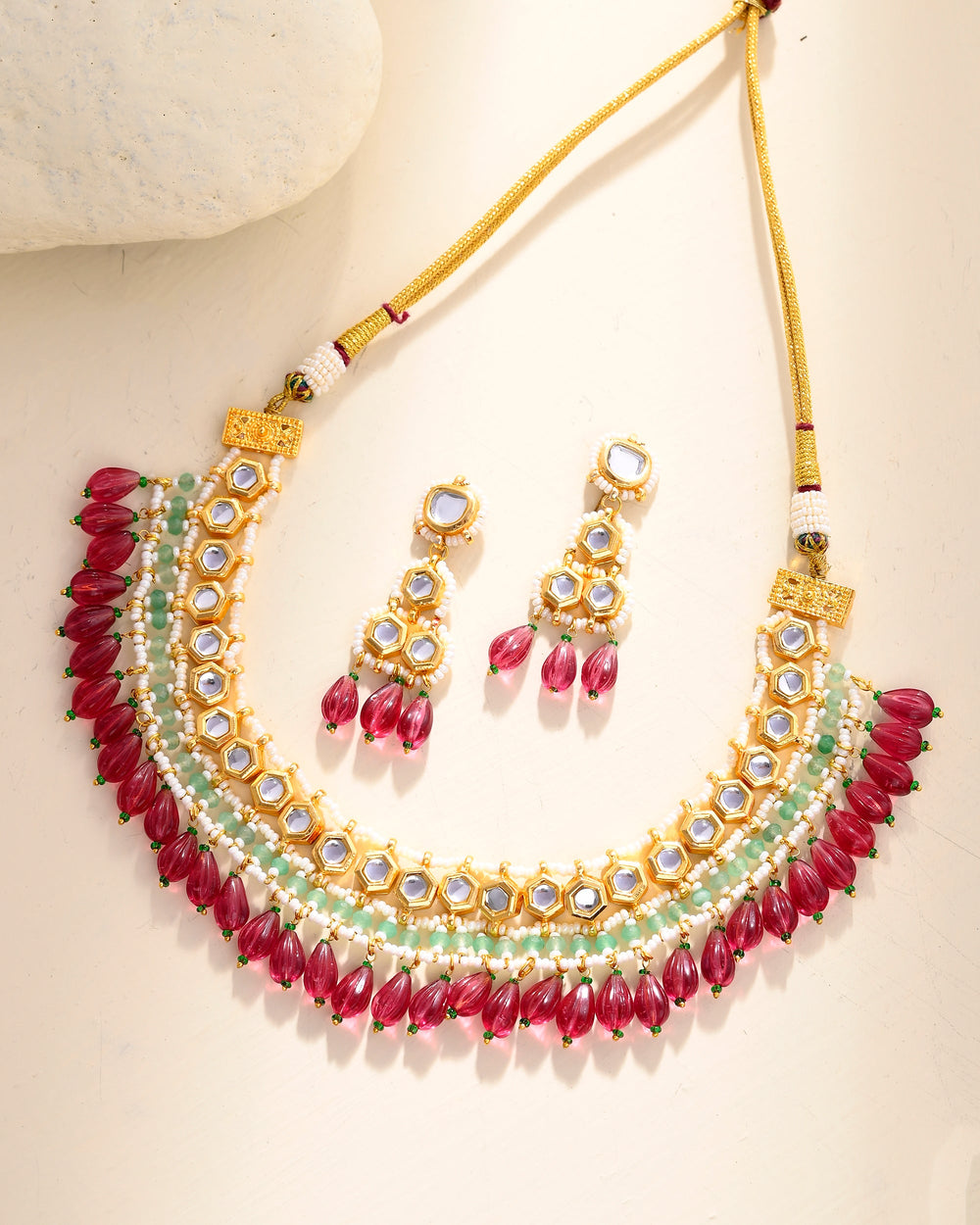 Dastoor Gold-Plated Pink Green Kundan-Studded Beaded Jewellery Set