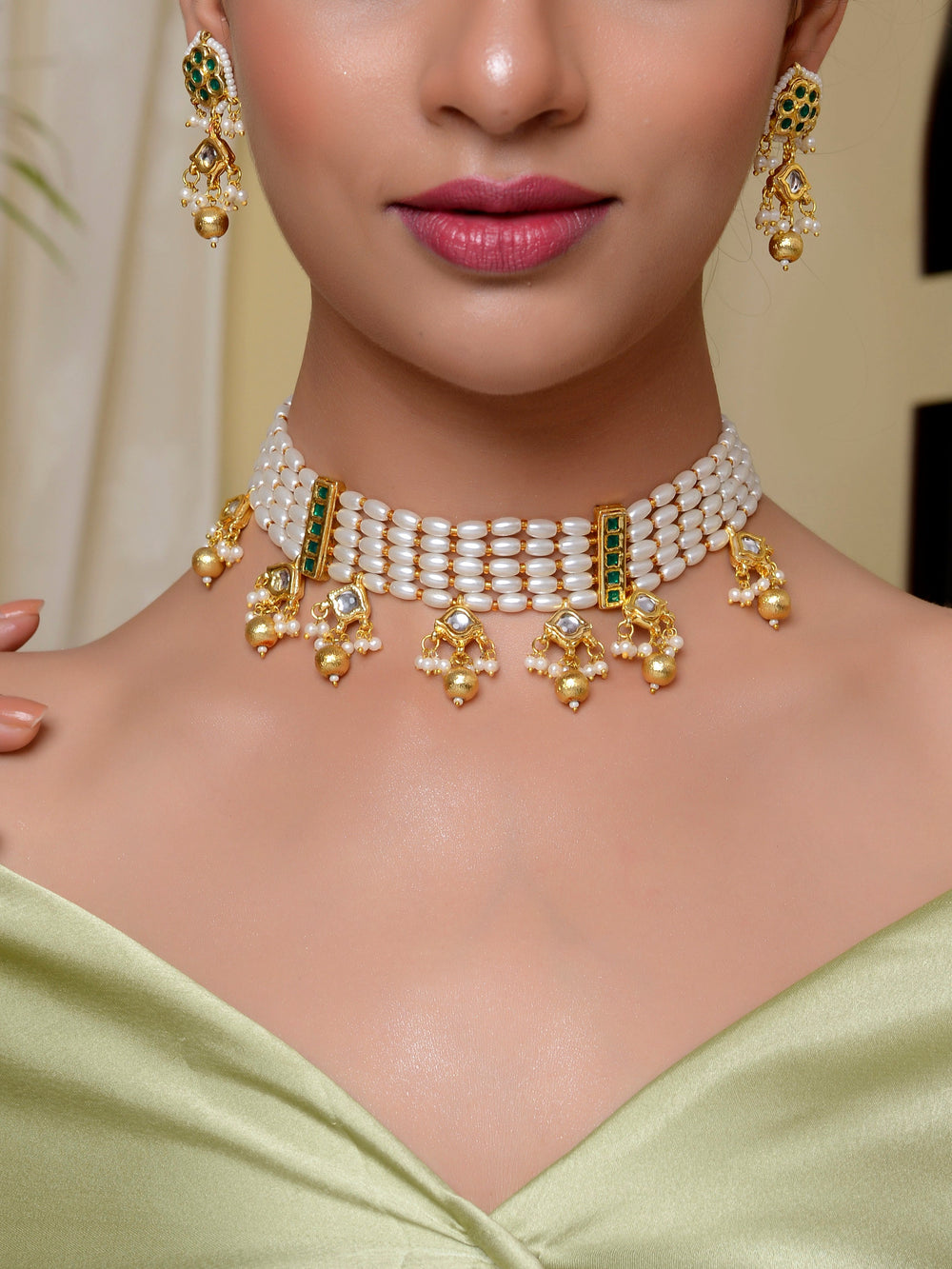 Gold-Plated White Kundan Studded Beaded Jewellery Set