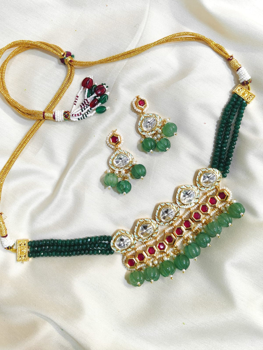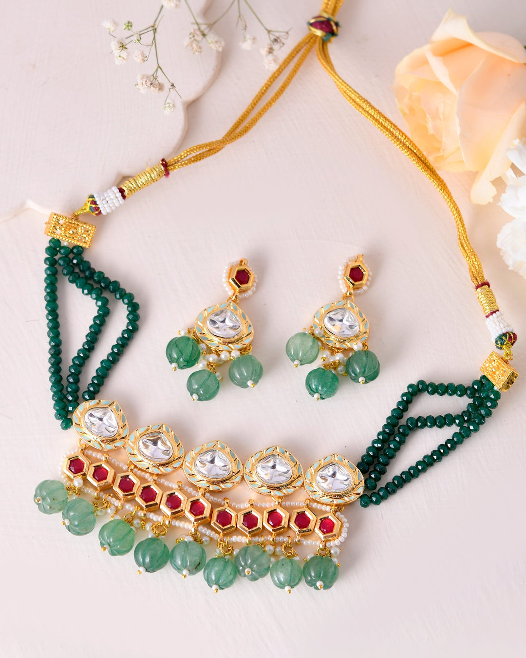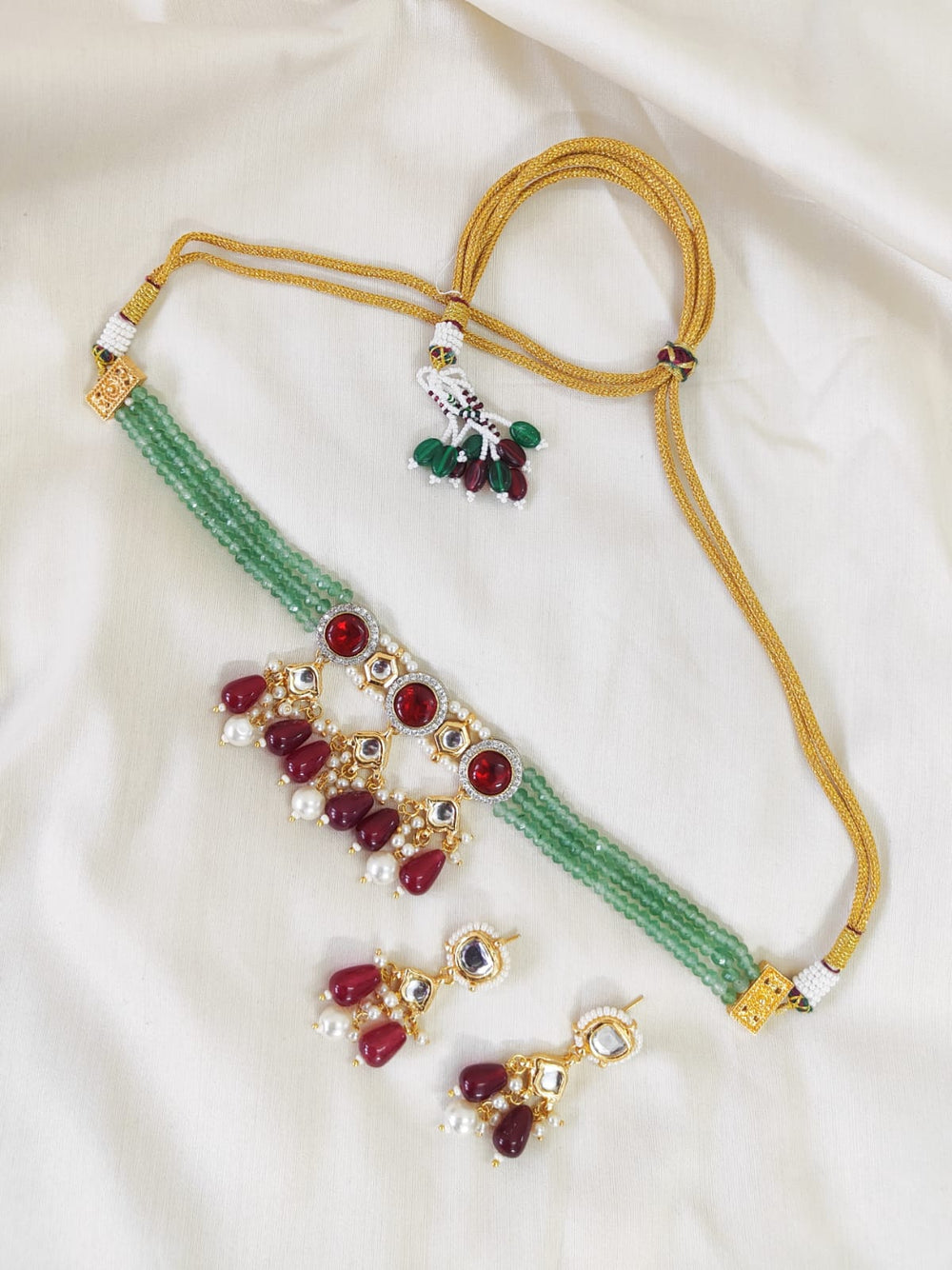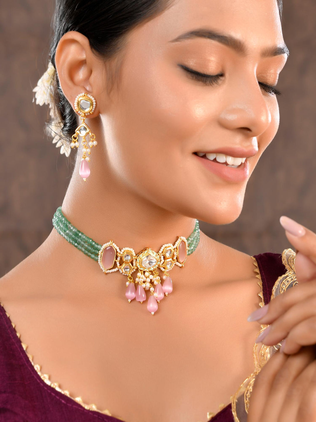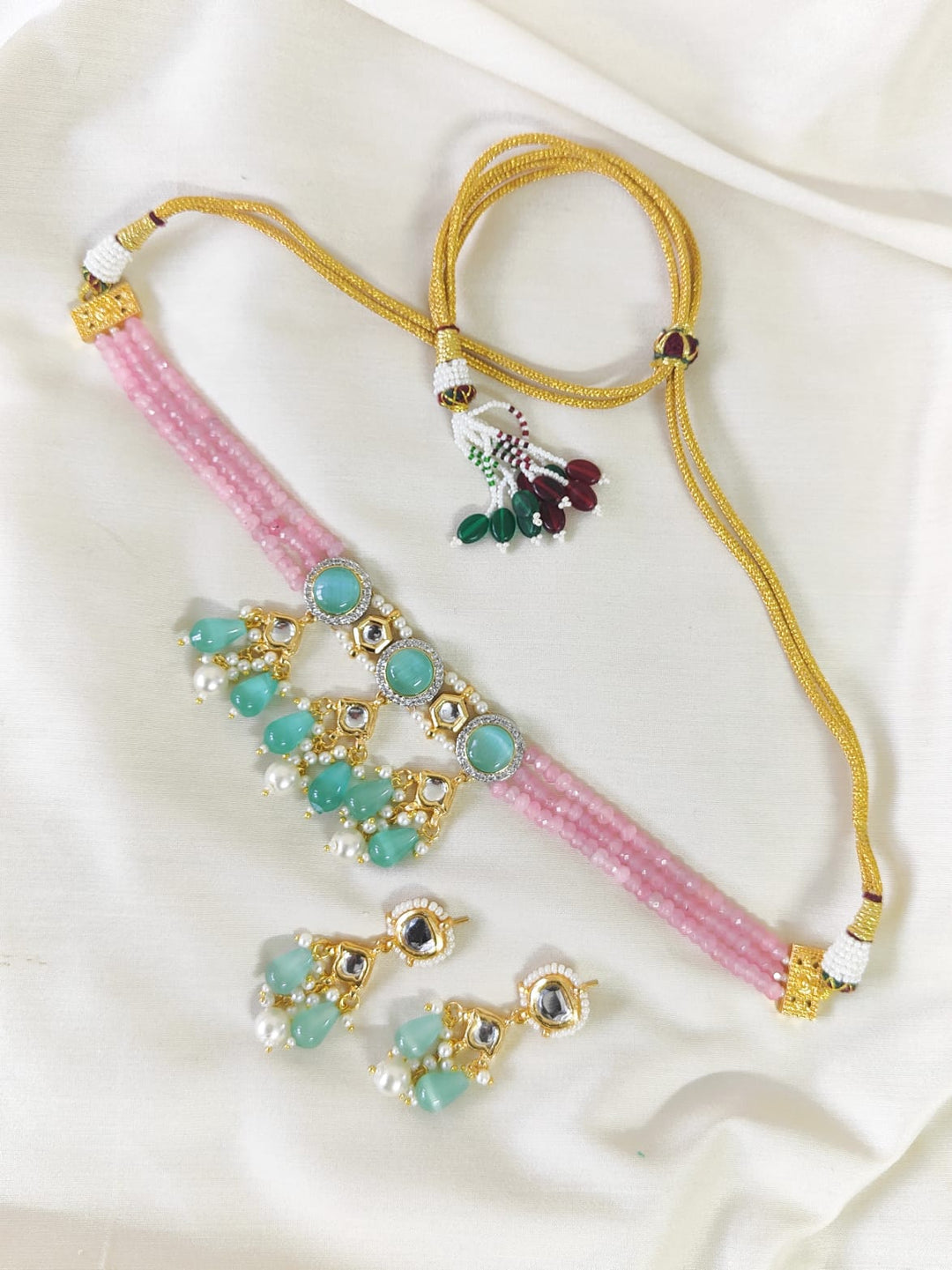 The semi-precious stones bring natural beauty, the kundan adds royal charm, the beads create graceful flow, and the meenakari adds colorful detailing – together forming jewellery that is unique, versatile, and timeless.