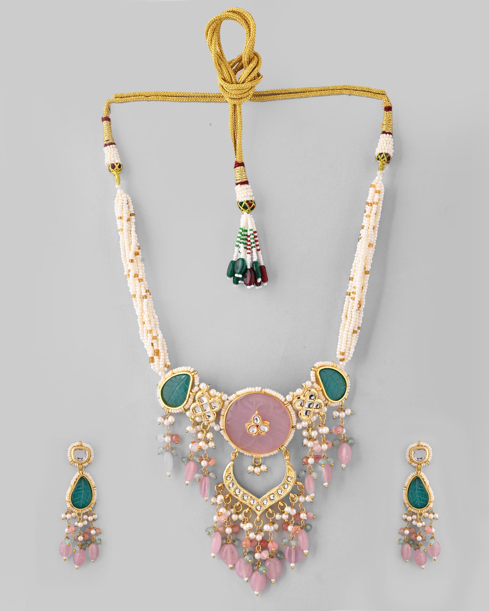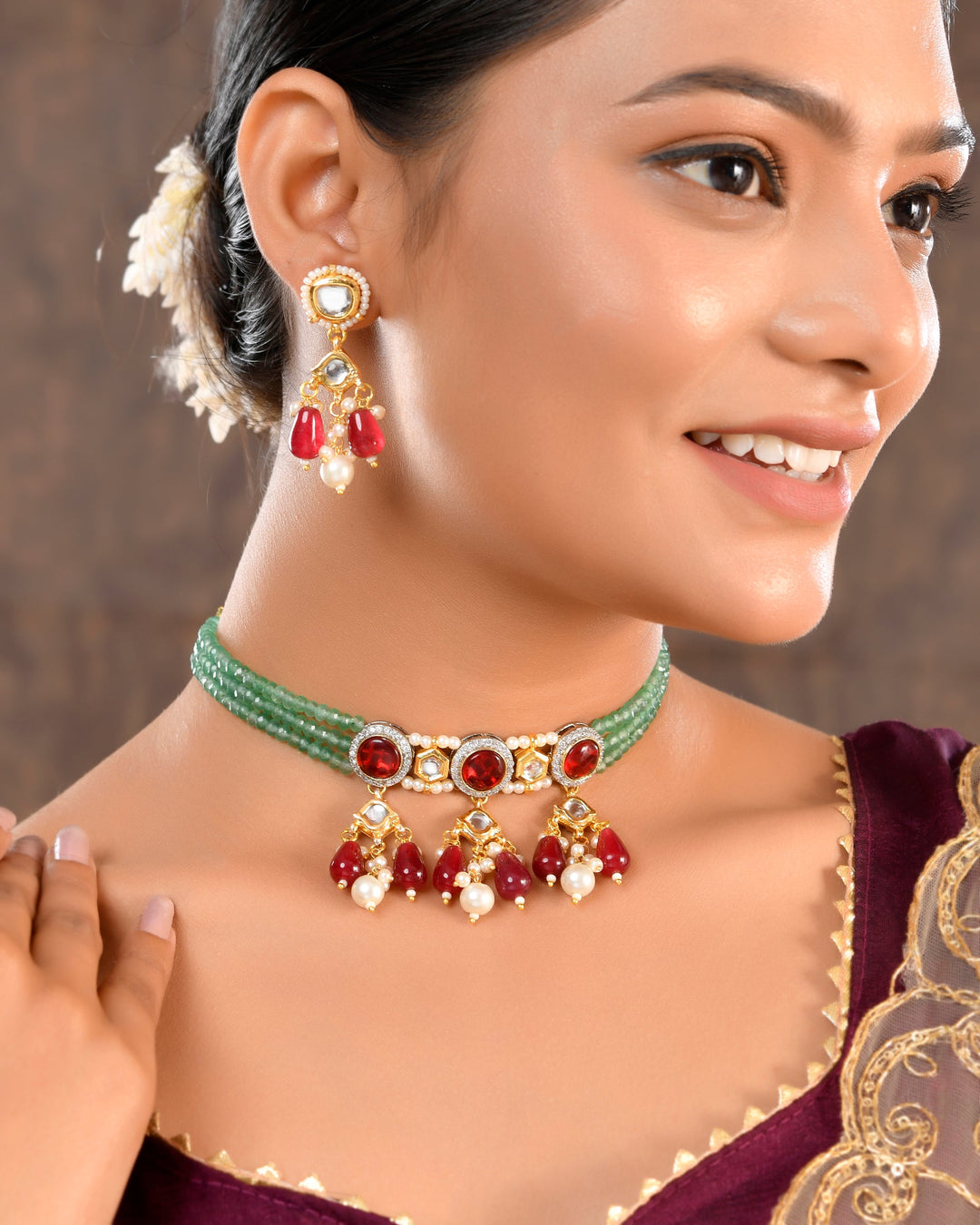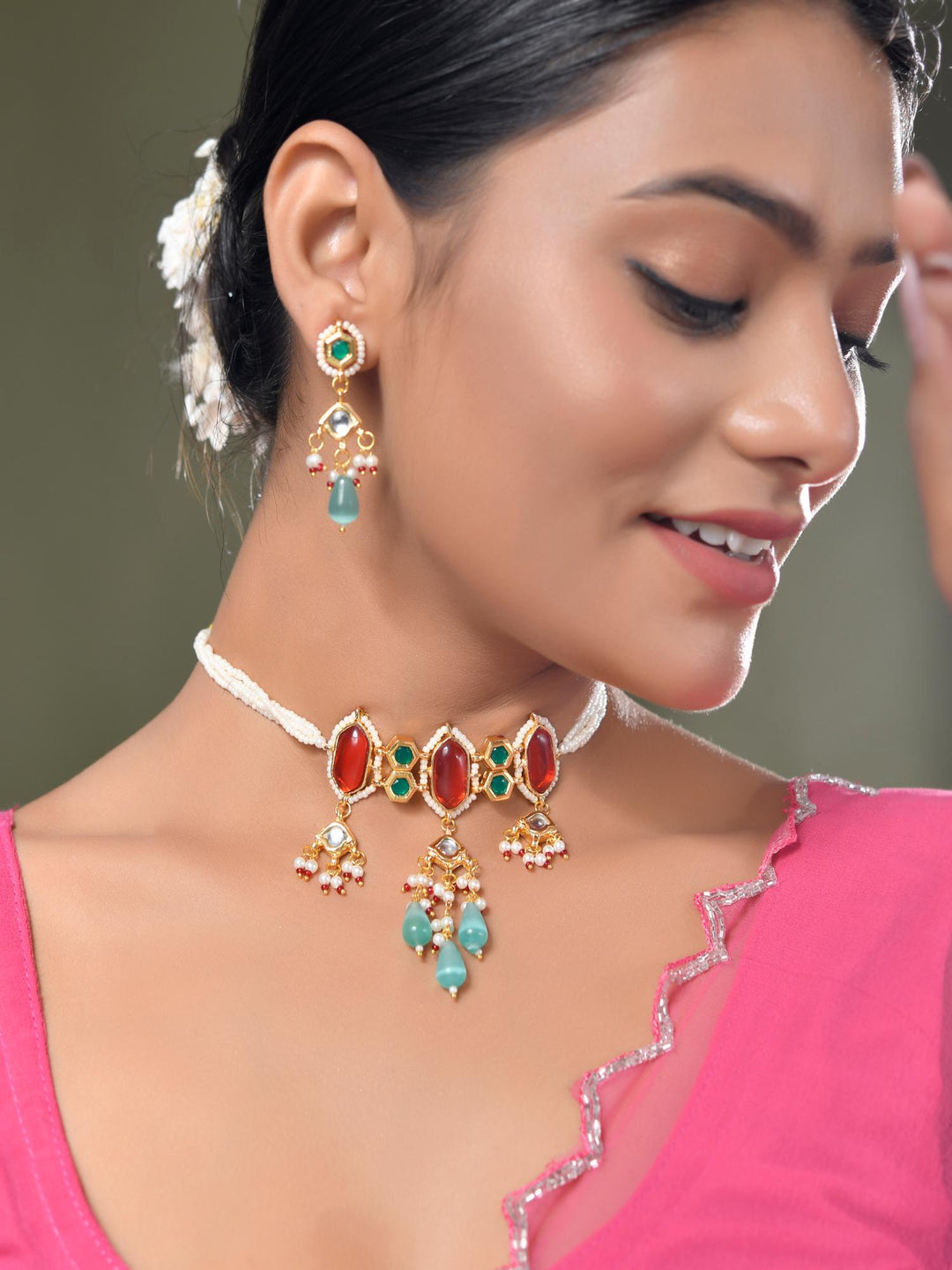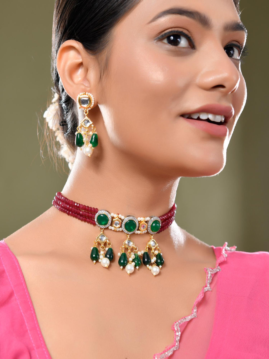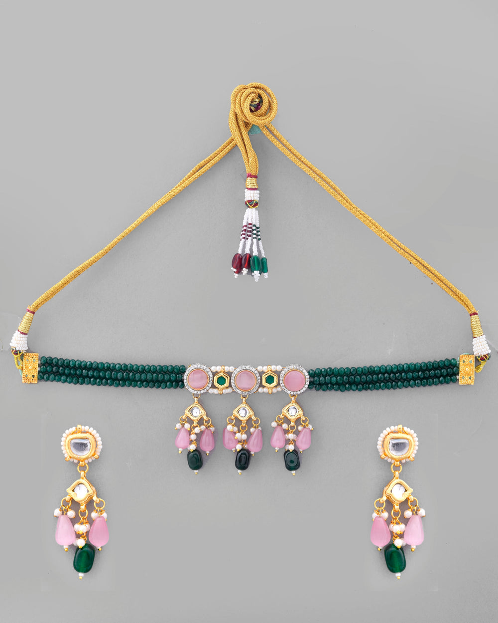 The semi-precious stones bring natural beauty, the kundan adds royal charm, the beads create graceful flow, and the meenakari adds colorful detailing – together forming jewellery that is unique, versatile, and timeless.