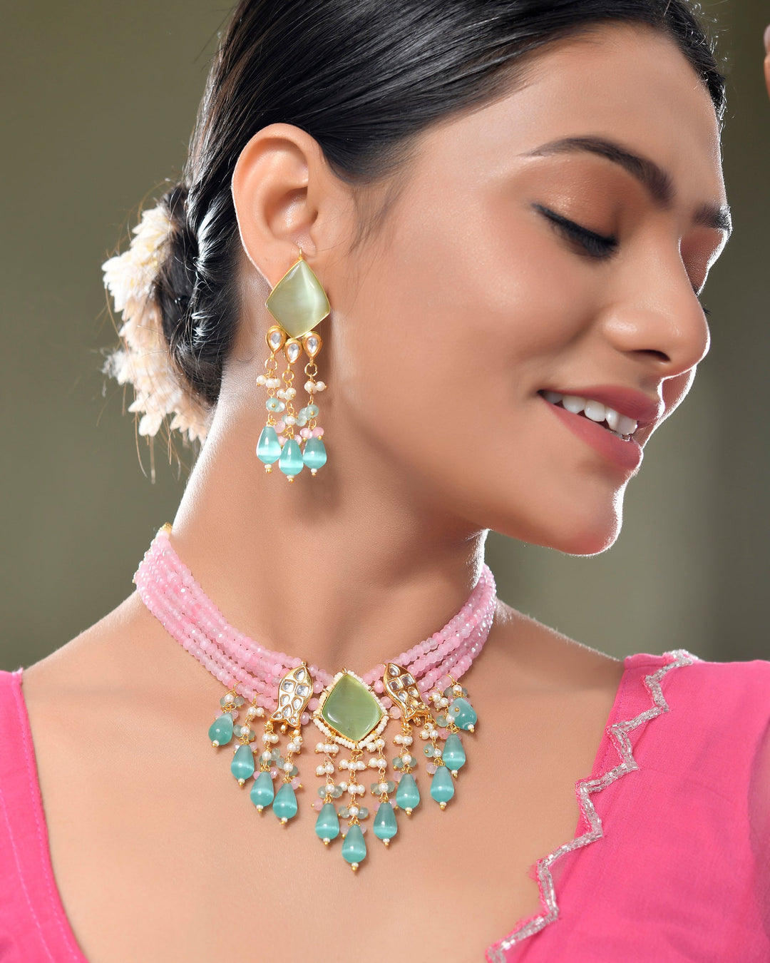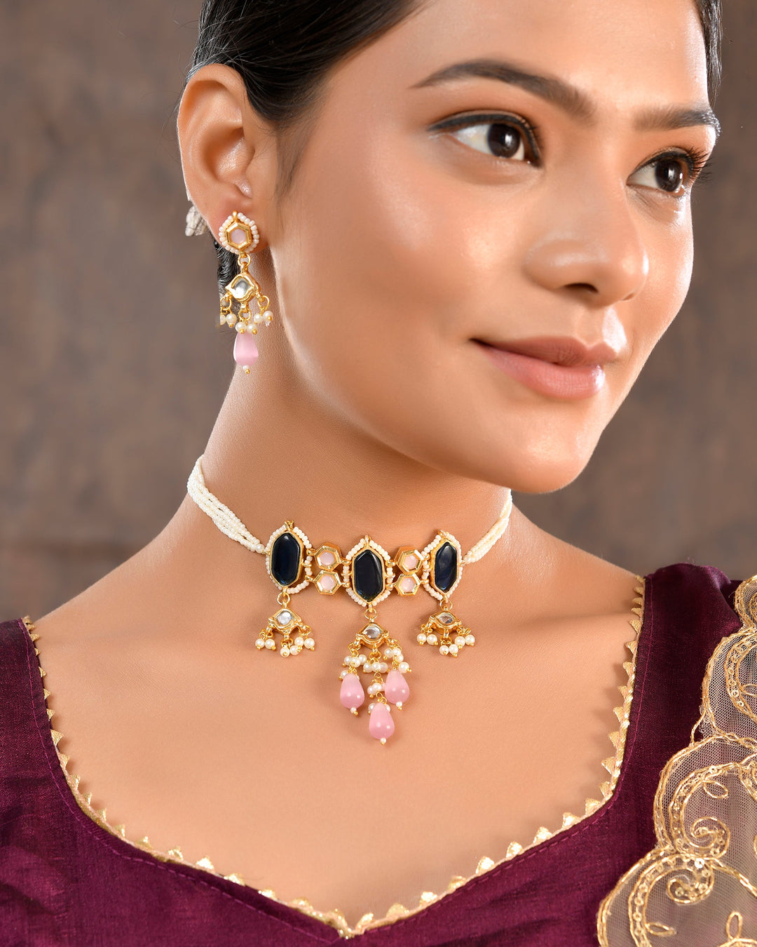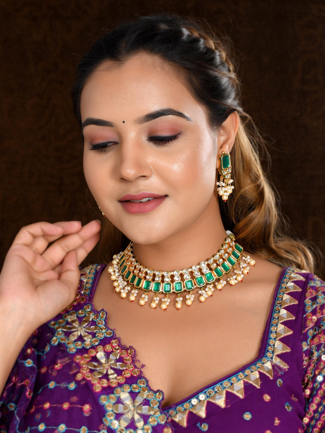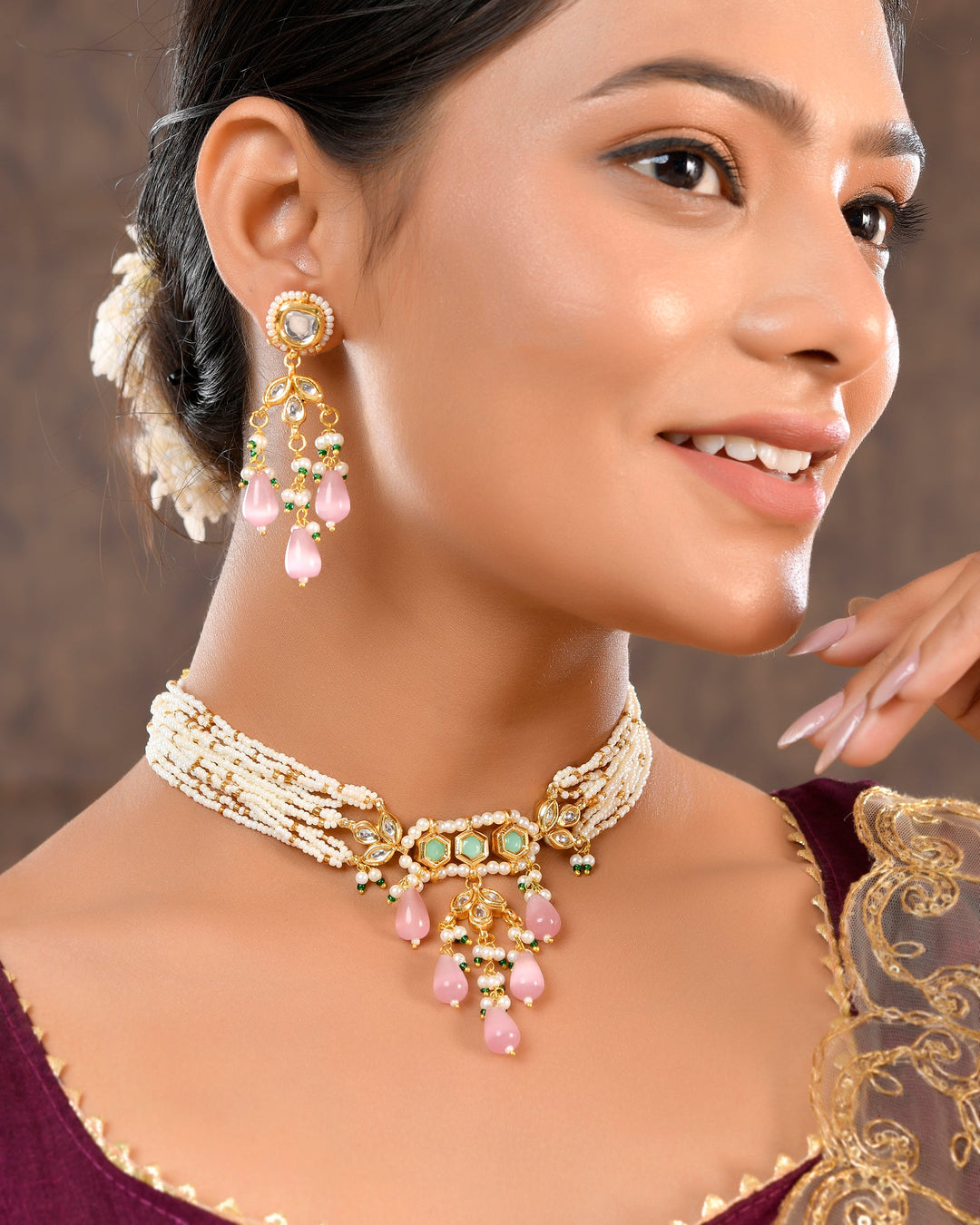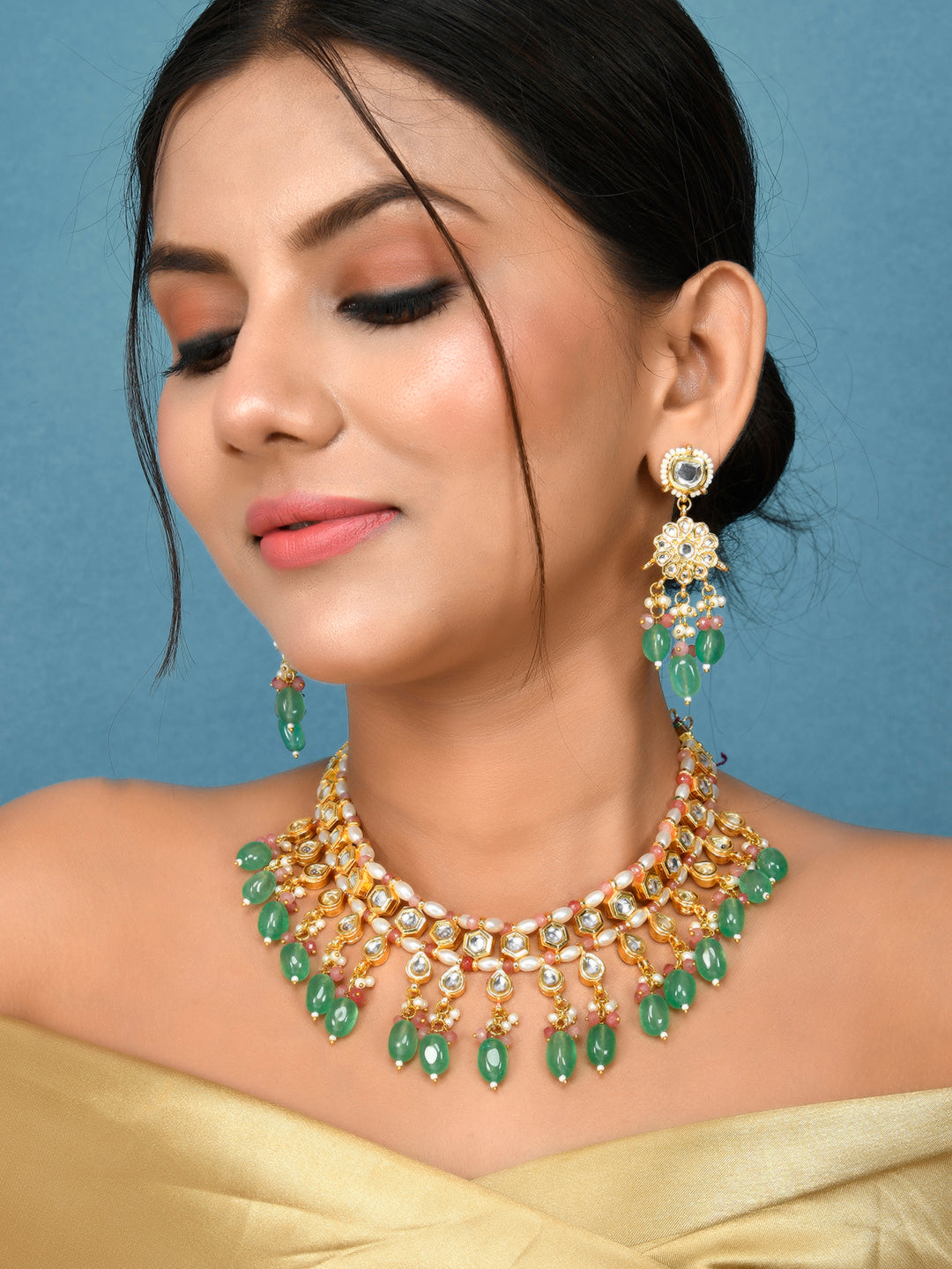 The semi-precious stones bring natural beauty, the kundan adds royal charm, the beads create graceful flow, and the meenakari adds colorful detailing – together forming jewellery that is unique, versatile, and timeless.