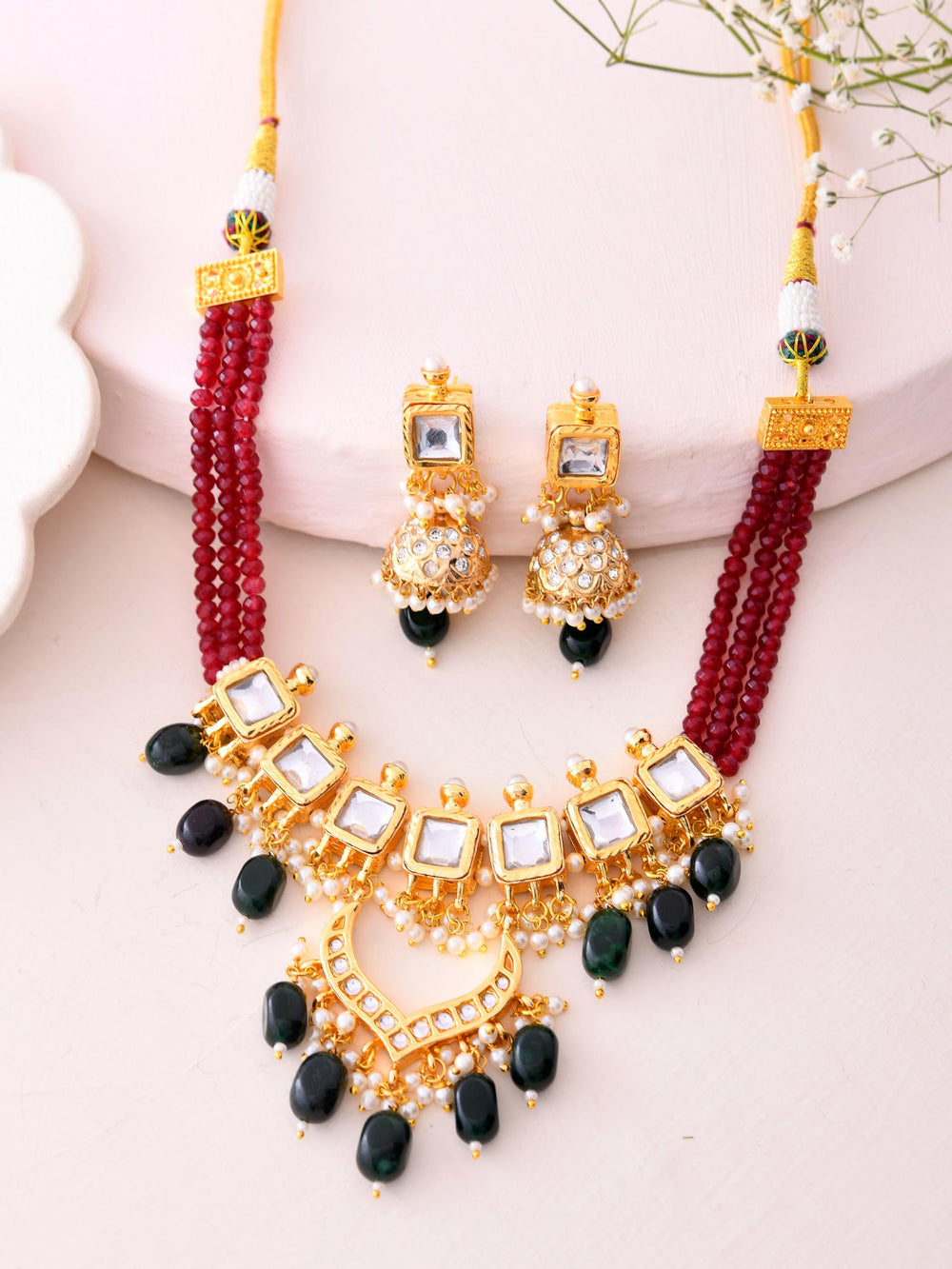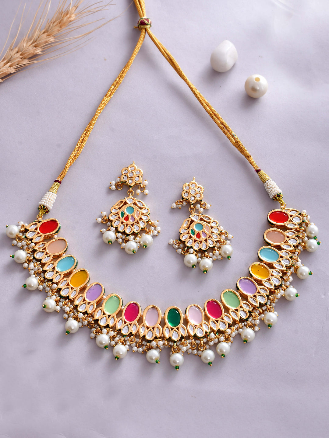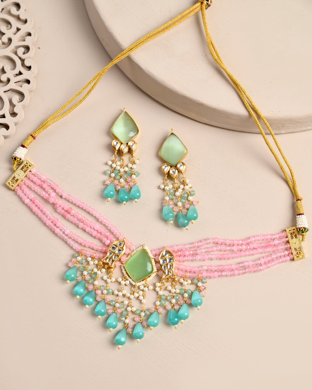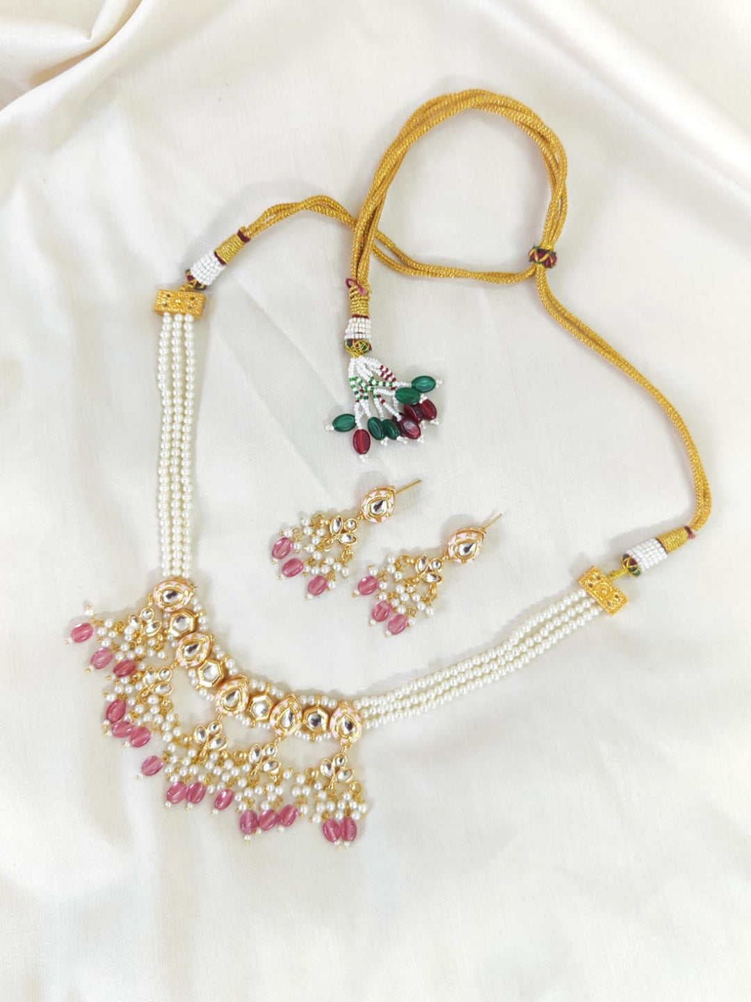 The semi-precious stones bring natural beauty, the kundan adds royal charm, the beads create graceful flow, and the meenakari adds colorful detailing – together forming jewellery that is unique, versatile, and timeless.