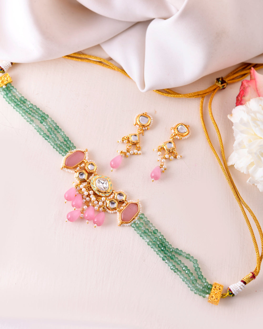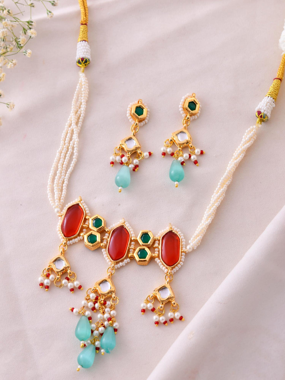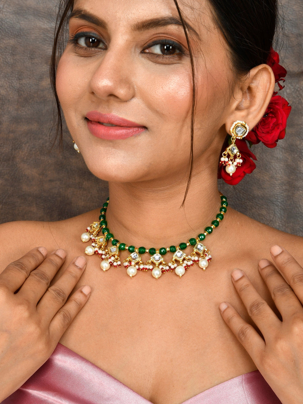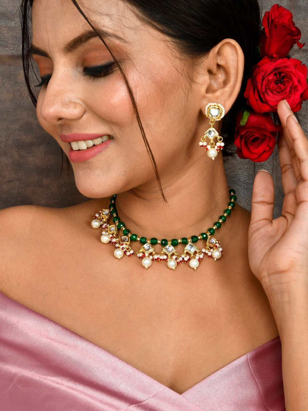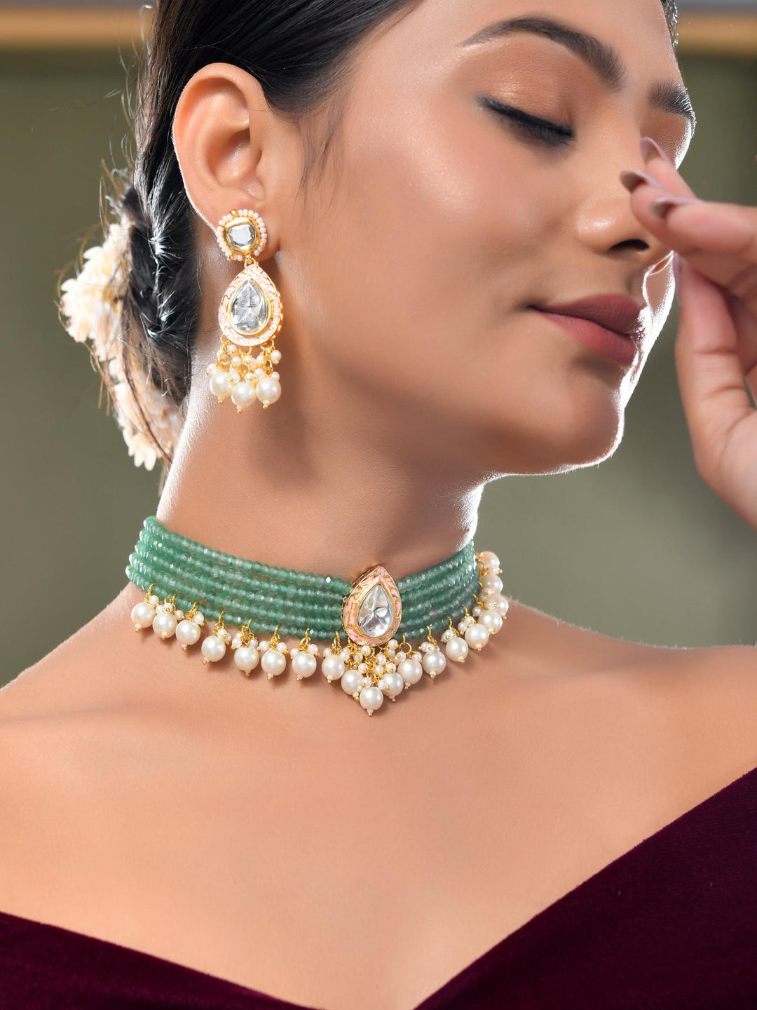 The semi-precious stones bring natural beauty, the kundan adds royal charm, the beads create graceful flow, and the meenakari adds colorful detailing – together forming jewellery that is unique, versatile, and timeless.