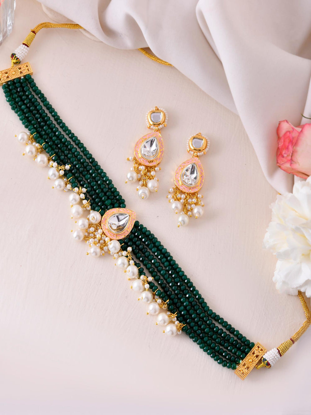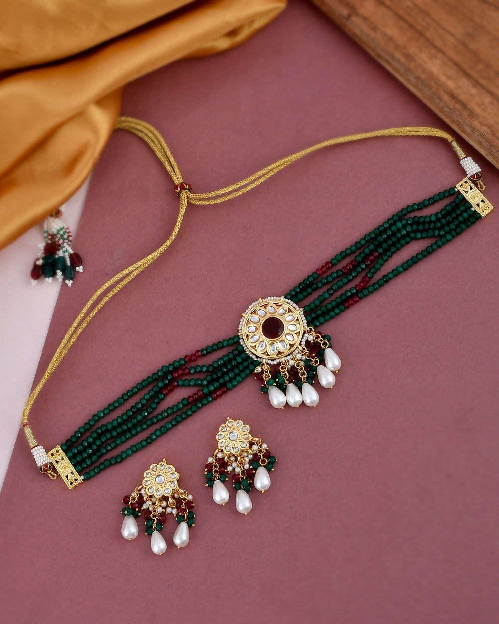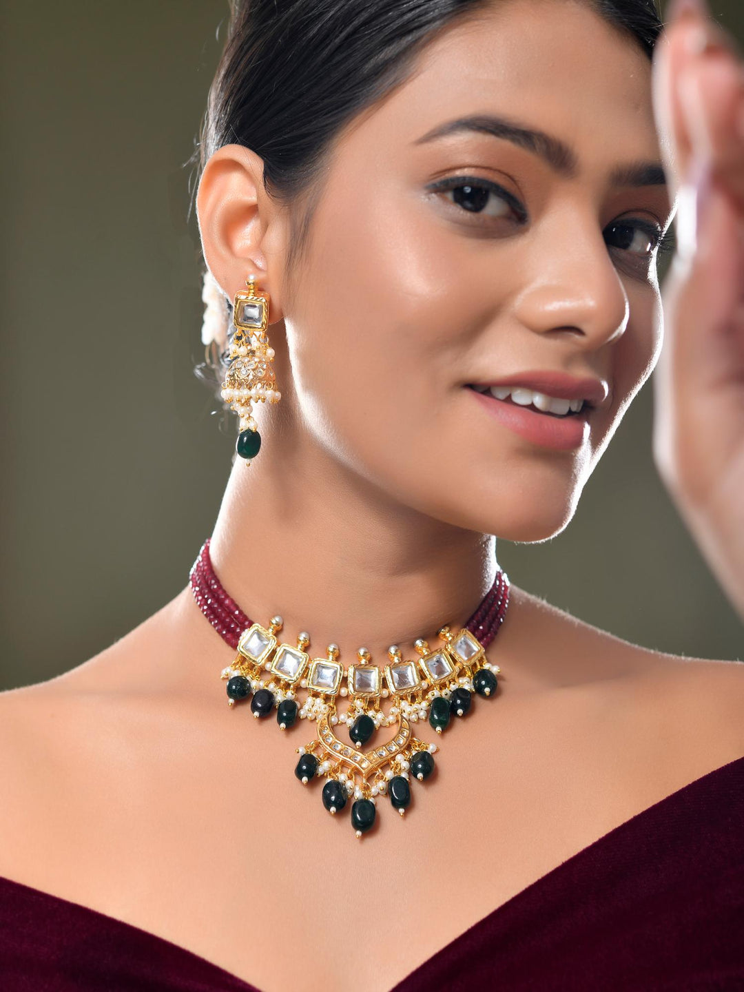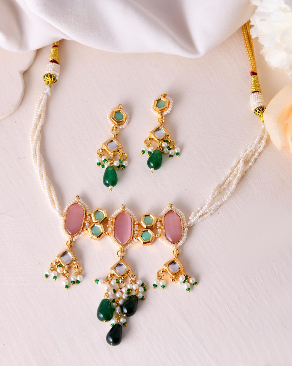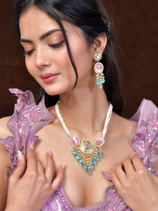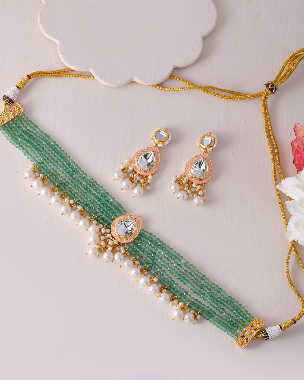 The semi-precious stones bring natural beauty, the kundan adds royal charm, the beads create graceful flow, and the meenakari adds colorful detailing – together forming jewellery that is unique, versatile, and timeless.
