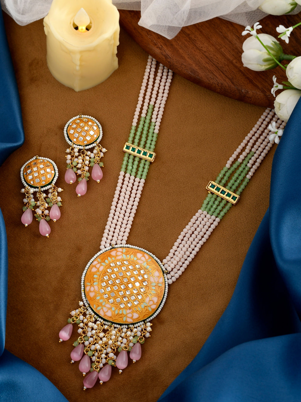 Yellow White Kundan-Studded Beaded Jewellery Set