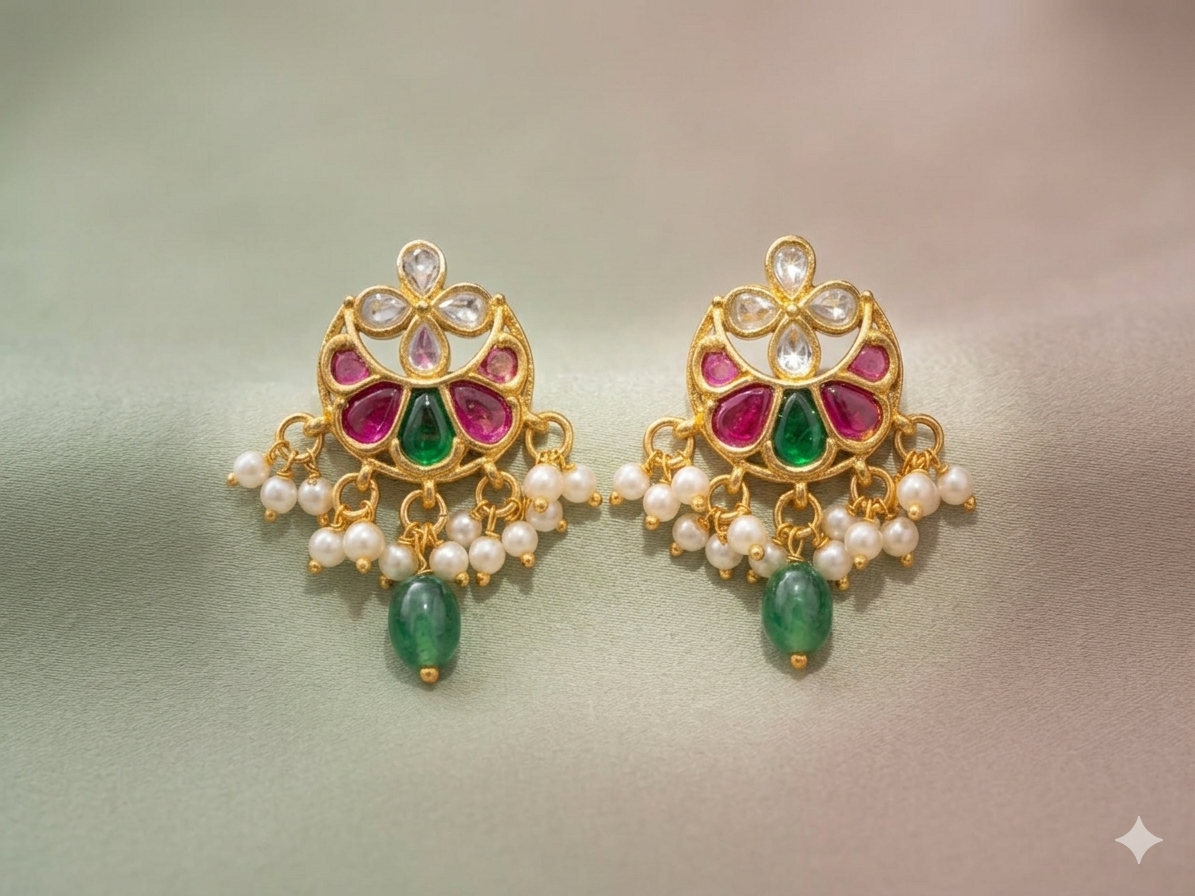 The design is further enhanced with vibrant pink and green stone detailing, which adds a colorful and festive touch. Below the stud, delicate pearl clusters are carefully arranged to create a soft, graceful movement, while the hanging green bead at the bottom adds uniqueness and charm. This combination of stones and pearls makes the earrings stand out and perfectly complements traditional outfits.